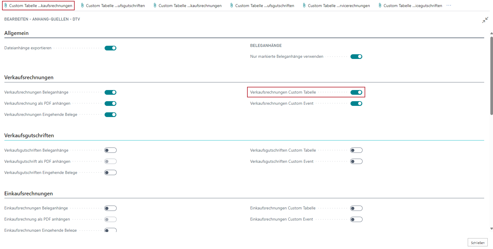 Wenn Sie in der Quelle des Anhangs die Option Custom Anhang auswählen möchten, muss vorher die entsprechende Seite ausgefüllt werden. Diese finden Sie im Menüband der Anhang-Quellen.