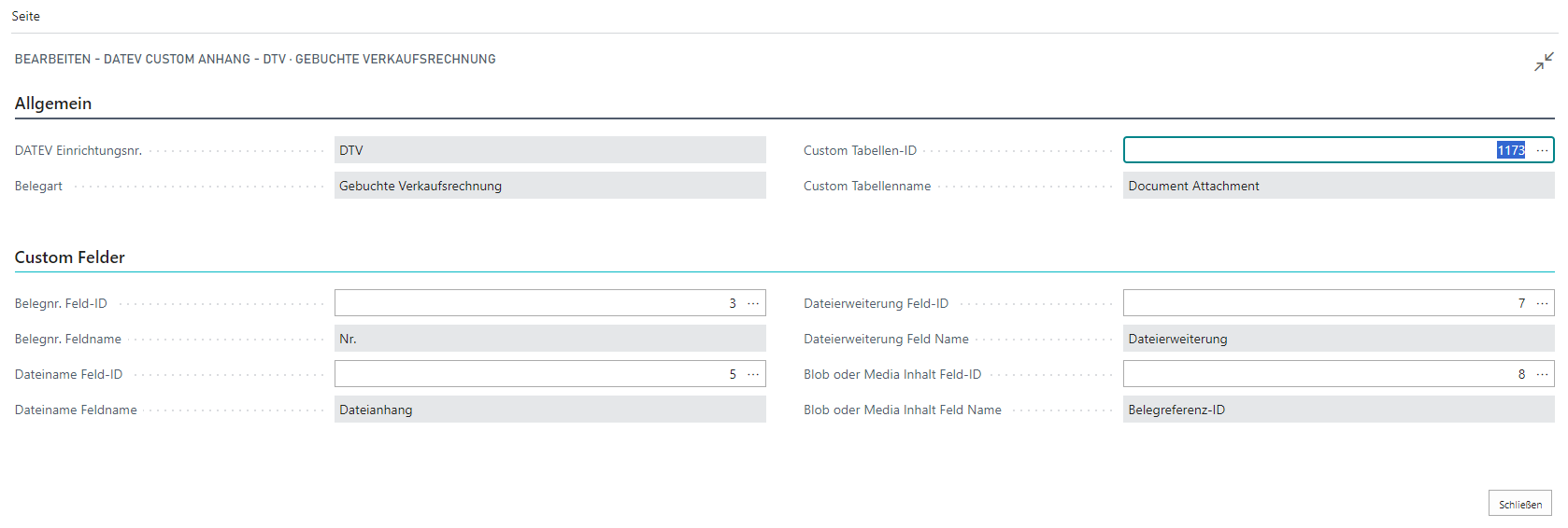 Richten Sie hier eine Tabelle ein, die der im Buchungsdatenservice als Puffer dienende Tabelle DATEV Exportierte Anhänge im weitesten Sinne entspricht. Beispielhaft wurden hier zwei Tabellen aus dem BC-Standard eingerichtet: