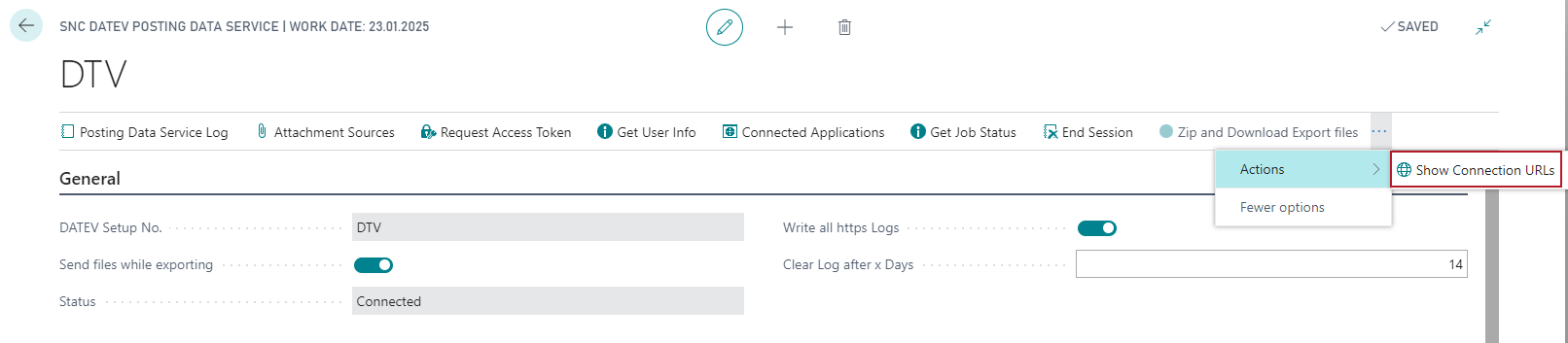 In the DATEV Buchungsdatenservice setup, you can also view all connection URLs and customize the State redirect URL as you wish. However, you must first make this section visible. To do this, select the Display connection URLs action in the menu.