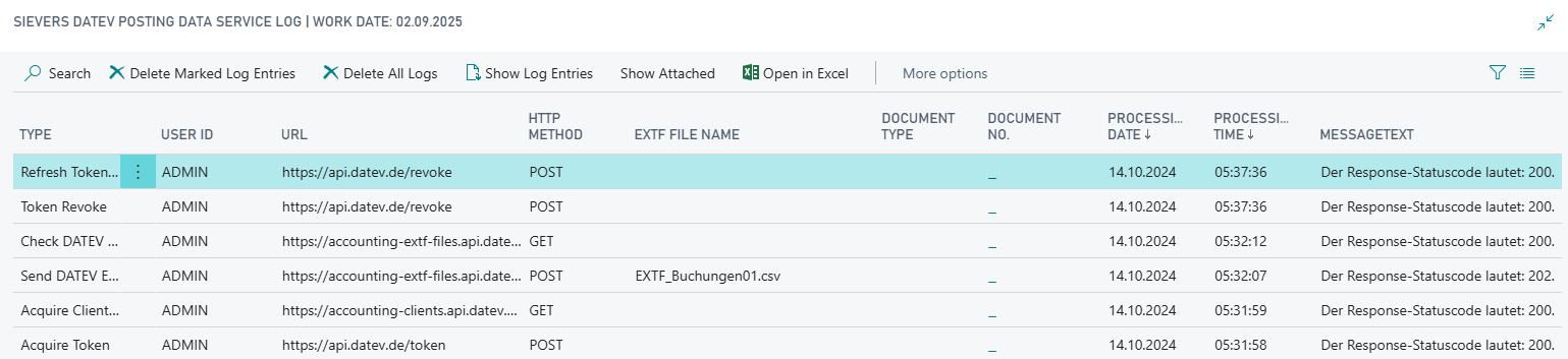 Via the DATEV Posting Data Service Log you are able to view a lot of information about the communication the the DATEV Rechenzentrum. In addition, any error messages are displayed in this log. In the menu area of the log you can also view further information about transferred data.