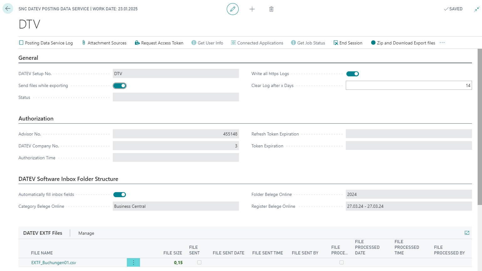 The setup takes place on the page SIEVERS DATEV Posting Data Service in business central.