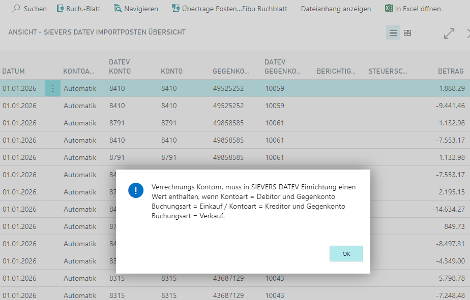 Werden solche Buchungssätze beim Import identifiziert und es ist keine "Verrechnungs Kontonr." im "Register Import" der "SIEVERS DATEV Einrichtung Karte" hinterlegt, erhalten Sie eine Fehlermeldung.