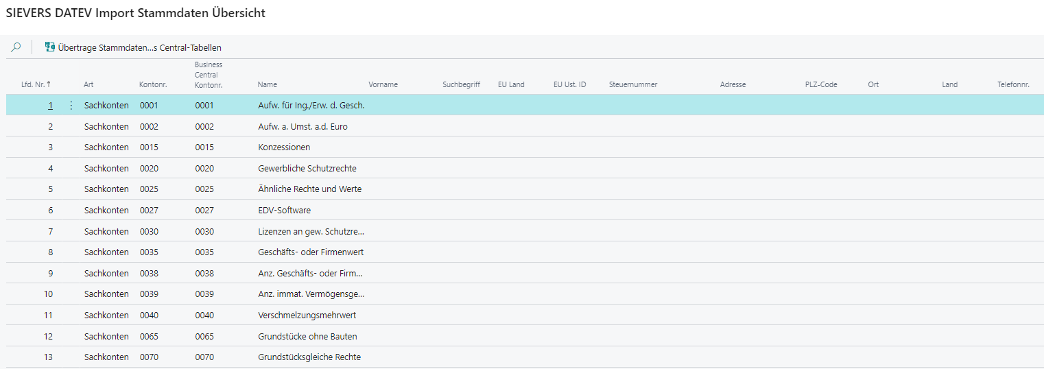 Die Kontonummern der DATEV werden unter Berücksichtigung der bei Sachkonten, Debitoren und Kreditoren hinterlegten "DATEV Kontonr." in die von Dynamics NAV/Business Central verwendeten Konten umgesetzt. Dabei wird auch die "Kontoart" bzw. "Gegenkontoart" eingesetzt.