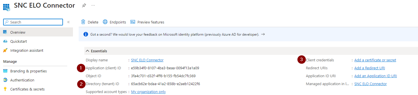 Nach der Registrierung werden einige wichtige Daten angezeigt. Speichern Sie sich die Application ID (1) und die Directory ID (2) separat ab. Sie werden sie noch brauchen. Fügen sie anschließend ein Client Secret (3) mit Add a certificate or secret hinzu. Das ist für die Erstellung von Credentials notwendig.