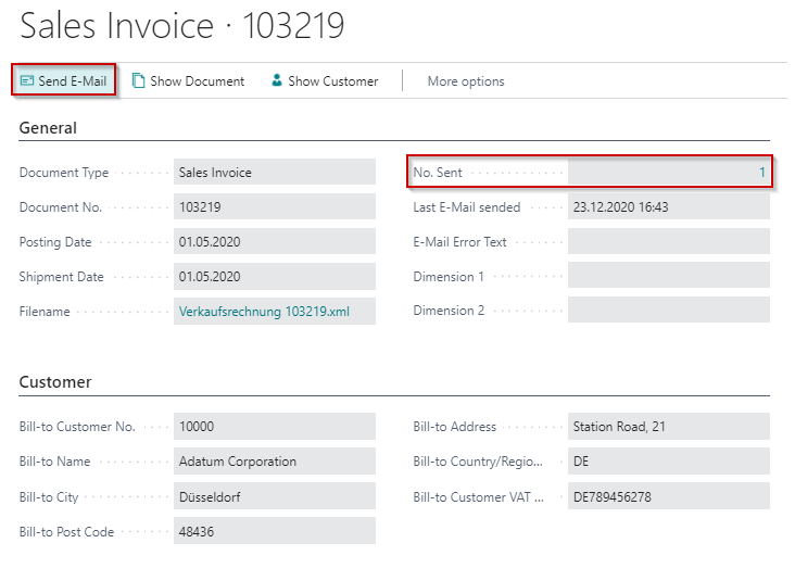 You can also use this procedure for a sales invoice, credit memo or service invoice or credit memo and generate and send an XML file that conforms to the standard E-Rechnung.