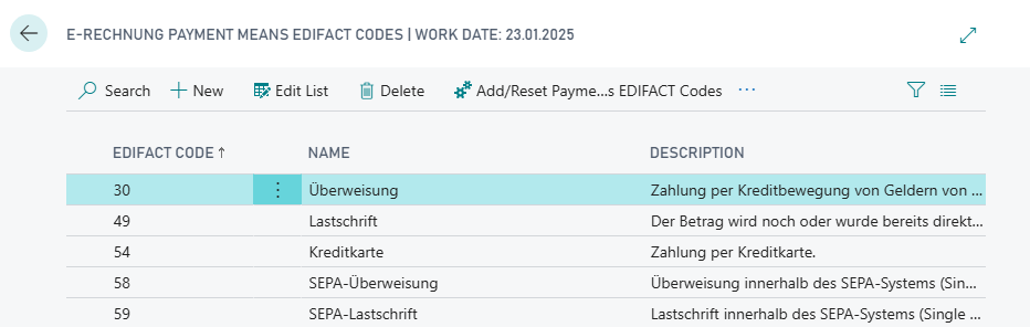 Furthermore you can restore the initally created EDIFACT Codes with the action Add/Reset Payment Means EDIFACT Codes. Manually created codes will not be touched by this.