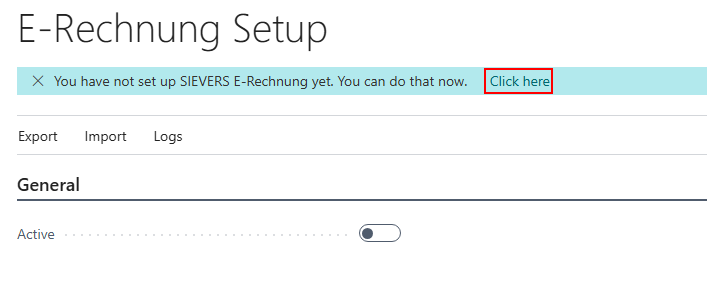 If SIEVERS E-Rechnung has not yet been set up a notification appears. This notification contains a link to the setup wizard.