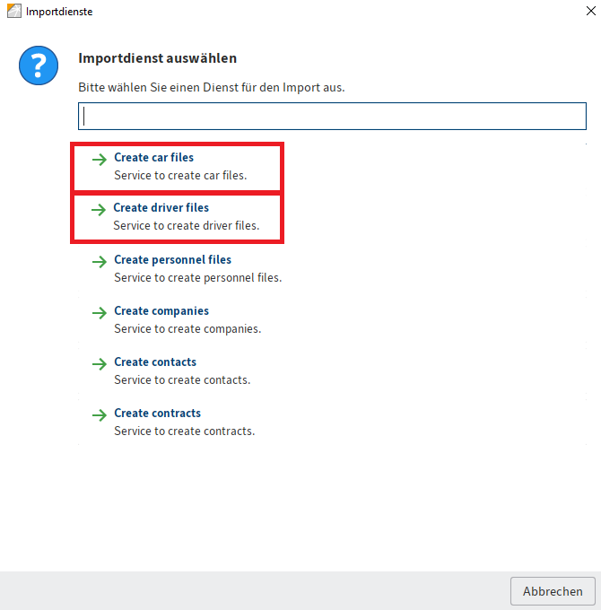 Hierüber kann die Art des Imports ausgewählt werden. Die erste Option stoßt dabei das Importieren von Fahrzeugakten an. Analog stoßt die zweite Option das Importieren von Fahrerakten an.