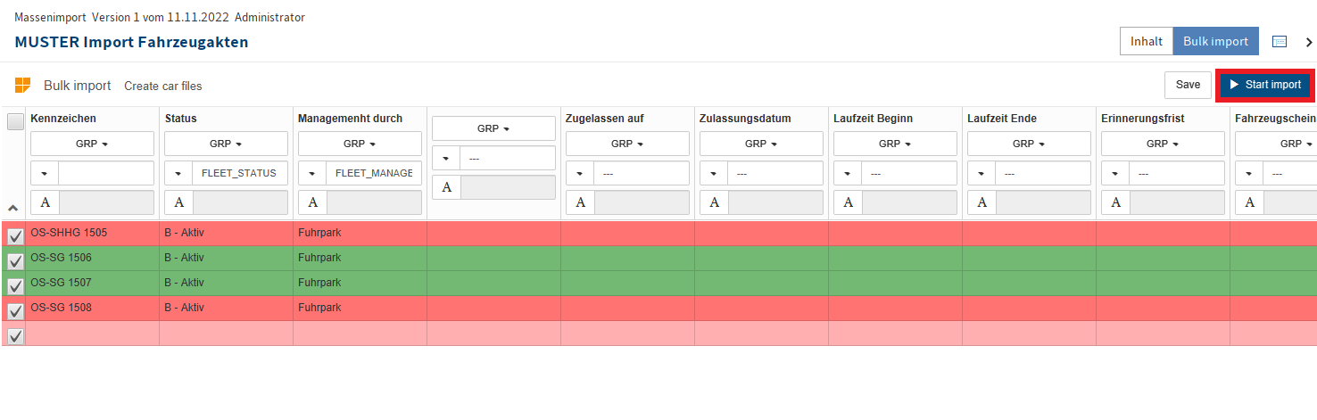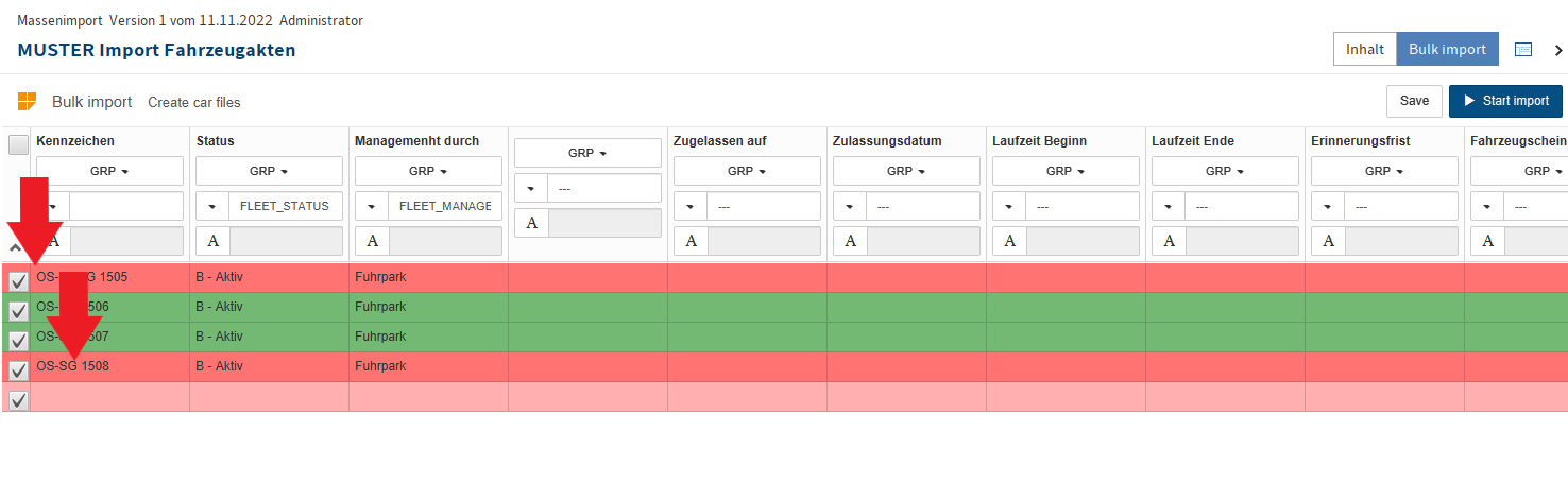 Falls Zeilen nicht importiert werden konnten, werden diese mit einer roten Hintergrundfarbe versehen. Diese entstehen z.B., wenn bestimmte Formatierungsrichtlinien nicht eingehalten wurden.