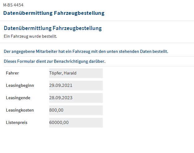- Wenn die Fahrzeugakte fertig erstellt wurde, bekommt die Buchhaltung eine Benachrichtigung über die Bestellung und die wichtigsten Eckdaten. Der Workflow ist jetzt abgeschlossen.