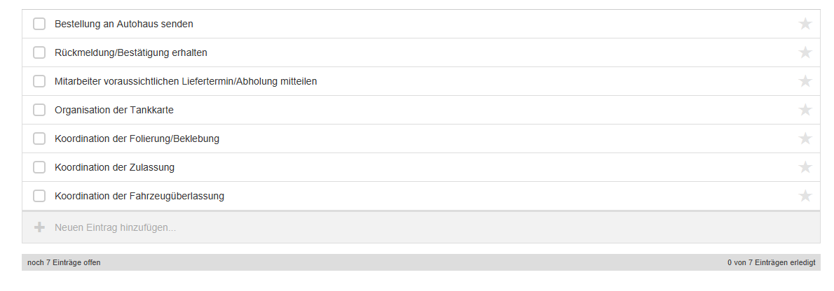 Das Fuhrparkmanagement bekommt nun einen Workflow mit einer Checkliste. In dieser Checkliste befindet sich eine Reihe von Aufgaben. Hier können Sie auch neue Aufgaben hinzufügen.