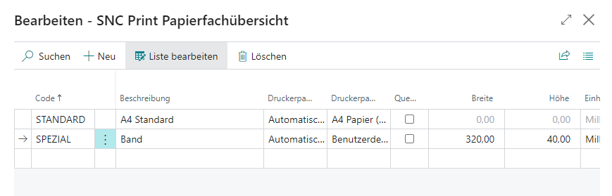 Auf der Papierfachübersicht gibt es folgende Felder: