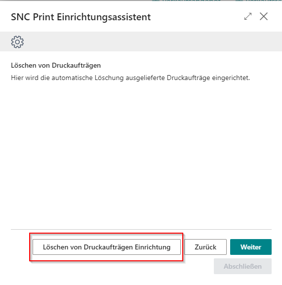 Der nächste Schritt besteht darin, eine Löschautomatisierung einzurichten. Diese dient dazu, bereits ausgelieferte Druckaufträge zu entfernen. Wenn Sie im Einrichtungsassistenten auf Löschen von Druckaufträgen Einrichtung klicken, wird automatisch ein Löschauftrag im BC-Standard erstellt und gestartet. Er ist so konfiguriert, dass Druckaufträge nach 60 Minuten entfernt werden. Falls Sie diesen bearbeiten möchten, müssen Sie ihn erst mit dem Vorgang Auf "Abwarten" setzen stoppen.