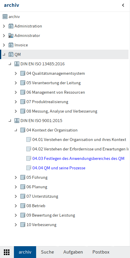 In der Archivstruktur finden Sie den Ordner QM. Hier sind beispielhaft die Ordnerstrukturen anhand der DIN EN ISO 13485:2016 und DIN EN ISO 9001:2015 hinterlegt. Dabei sind die Ordnungszahlen identisch der Kapitel in den Normen und folgen der Top-Level-Structure. Jeder Ordner der Archivstruktur ist mit eigenen Metadaten versehen. Diese beinhalten weitere Informationen zum jeweiligen QM Thema. Blau hervorgehobene Ordner sind QM Themen zu denen empfohlen wird mindestens ein QM Dokument zu erstellen.