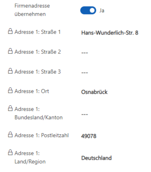 - Firmenadresse übernehmen: Bewirkt, dass die Adresseingabe gesperrt ist. Die Adresse wird nun aus der zugeordneten Firma übernommen.