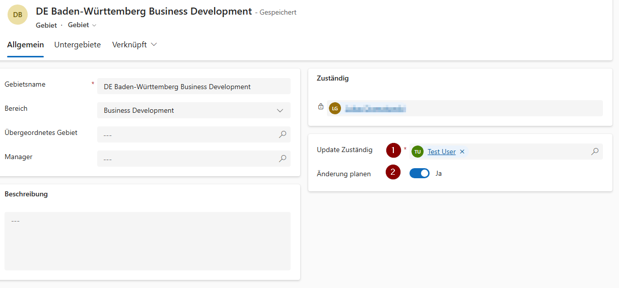 Die Felder Update Zuständig und Änderung planen ermöglichen die spätere Änderung der Zuständigkeit. So ist gewährleistet, dass Änderungen nicht versehentlich umgesetzt werden. Mehr dazu finden Sie unter Zuordnung ändern.