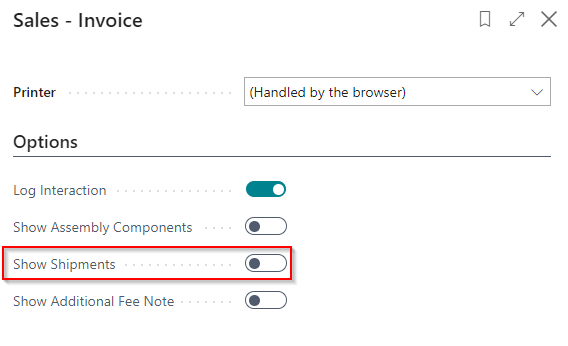 SNC Report Pack also allows you to print shipment numbers in your sales invoices. To do this, simply use the Show Shipments function in the print options of the posted sales invoices.