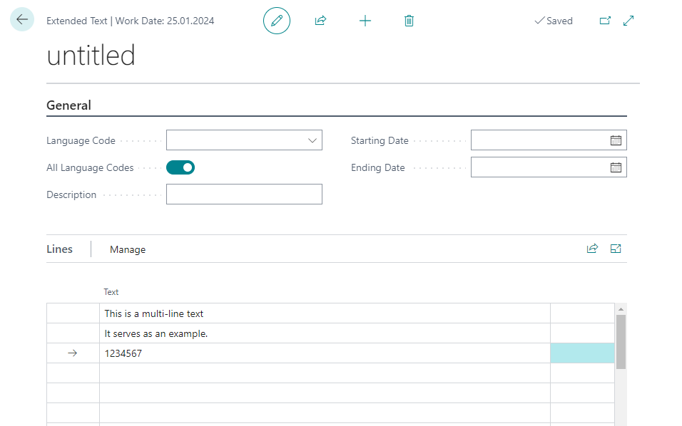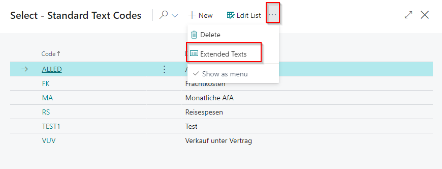 Then enter the desired code and a description in an empty line. Now while you still have selected the line you can open the Extended Texts page. This is a page of the BC standard.