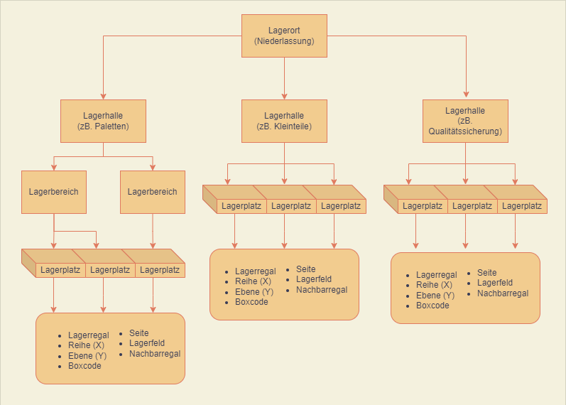 An oberster Stelle steht immer ein Lagerort. Dieser Lagerort kann eine oder mehrere Lagerhallen beinhalten. Eine Lagerhalle gehört immer zu einem Lagerort. In einer Lagerhalle können Lagerregale stehen. Ein Lagerregal wiederum ist in mehrere Ebenen aufgeteilt. Jede Ebene eines Lagerregals besteht aus einzelnen Reihen. Alle Informationen zusammen ergeben dann den Lagerplatzcodefür eines der Lagerfächer.
