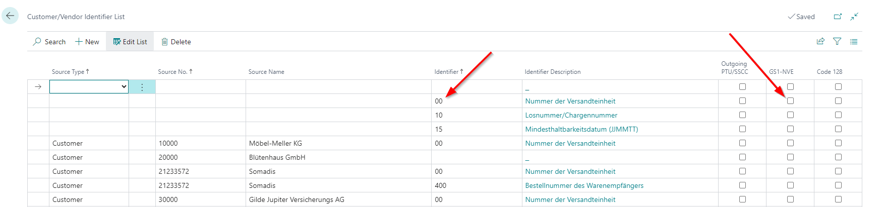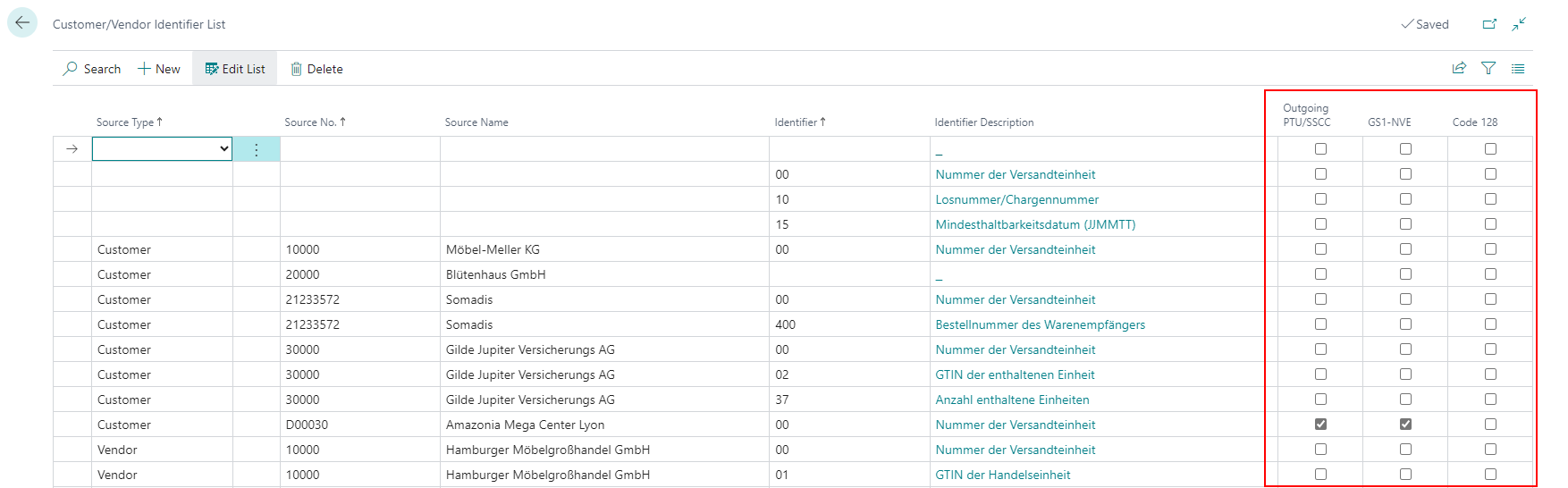 The Customer/Vendor Identifier List which can be opened from the GS1 Setup Page now includes three more option fields: