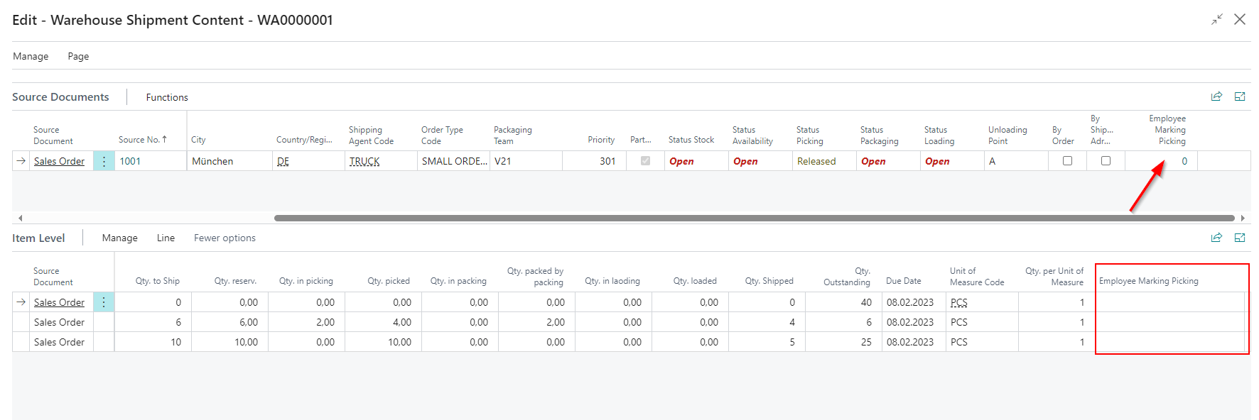 Employee markings are set in the picking document when an employee takes over a pick or a packing process via MDE. These employee markings can now also be viewed in Warehouse Shipment Planning at item level and in the source documents.