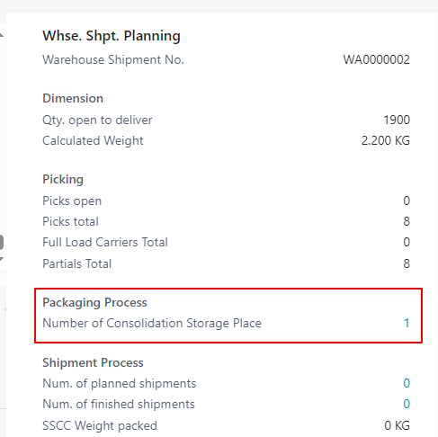 We have added the field Number of Consolidation Storage Place to the Warehouse Shipment Planning factbox. A click on the number opens a filtered SNCL Storage Place List.