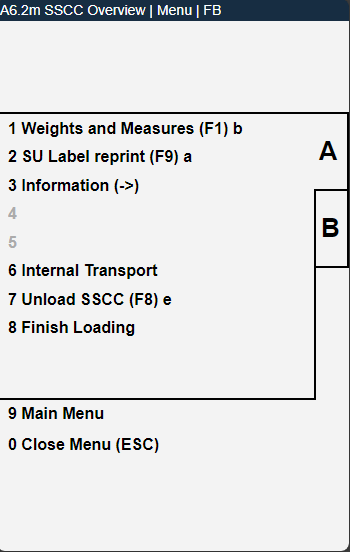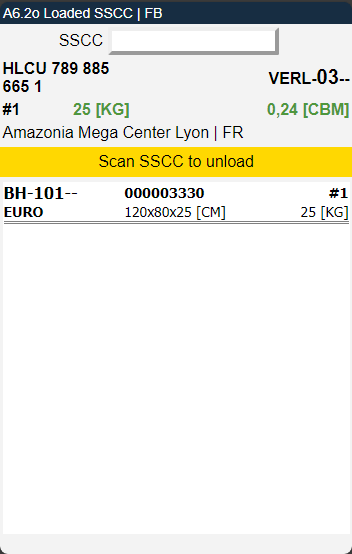 This page is opened by the action Change View in menu B of A6.1 and A6.2. This page shows the currently loaded SSCC of the selected loading process. These SSCC have been scanned two times in the loading process. A third scan of an SSCC will unload it and change its state from 8-Loaded to 7-Packed.