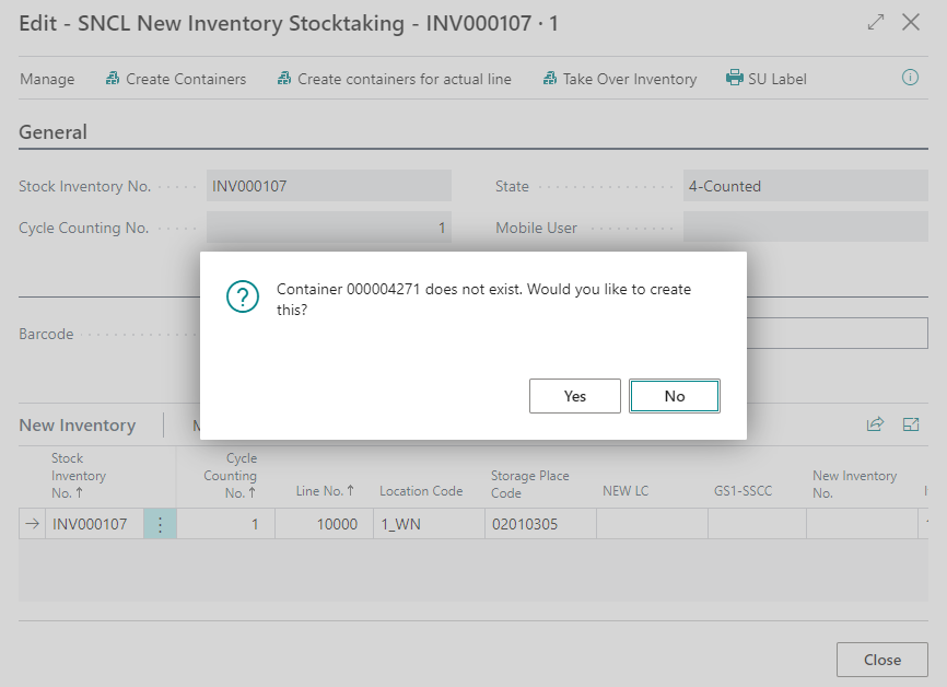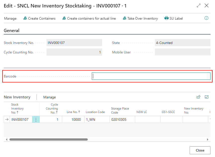 The new function New Inventory is also available on the Cycle Counting Lines. When you selected a specific line, the storage place will be entered as suggestion in the New Inventory form.