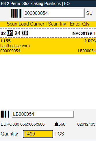 Here you can scan a Storage Place. After this, the MDE will then open B3.2 Perm. Stocktaking Positions, where you can tap on and correct the inventory you want to adjust. This whole process will take place in a SNCL stocktaking with the type Inventory Correction MDE.