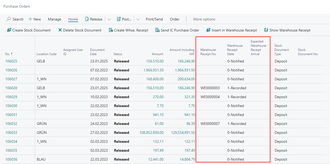 In order to improve the overview and to be able to see if there is already an assigned Warehouse Receipt, we have added the following columns to the Purchase Order List:
