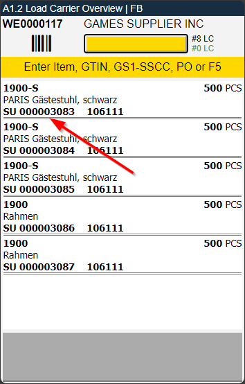 In a warehouse receipt, it can happen that there are several identical load carriers with the same quantity. Clear identification is therefore not possible. In such cases, the load carrier with the lowest load carrier number is automatically selected.