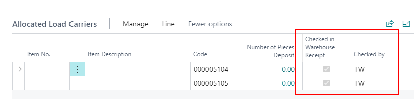 We have added the fields Checked in Warehouse Receipt and Checked By in the Allocated Load Carrier lines of these pages: