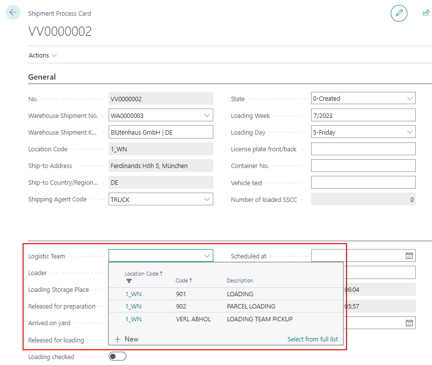 The Selection of SIEVERS WMS Team/Logistic Team in the Shipping Process Card is now possible via Drop Down Menu.