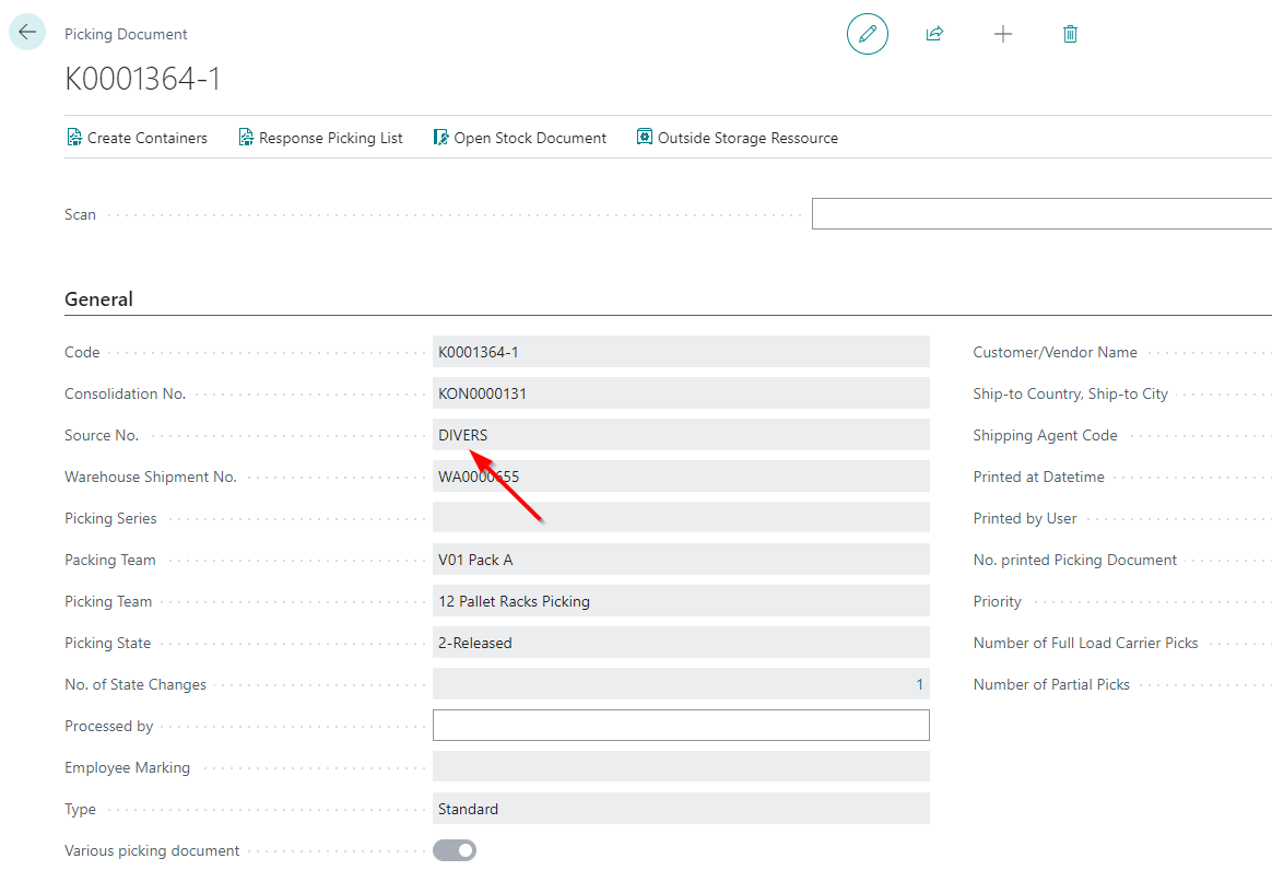 - If it is a diverse picking document that contains lines for several source documents, diverse is displayed for the source no