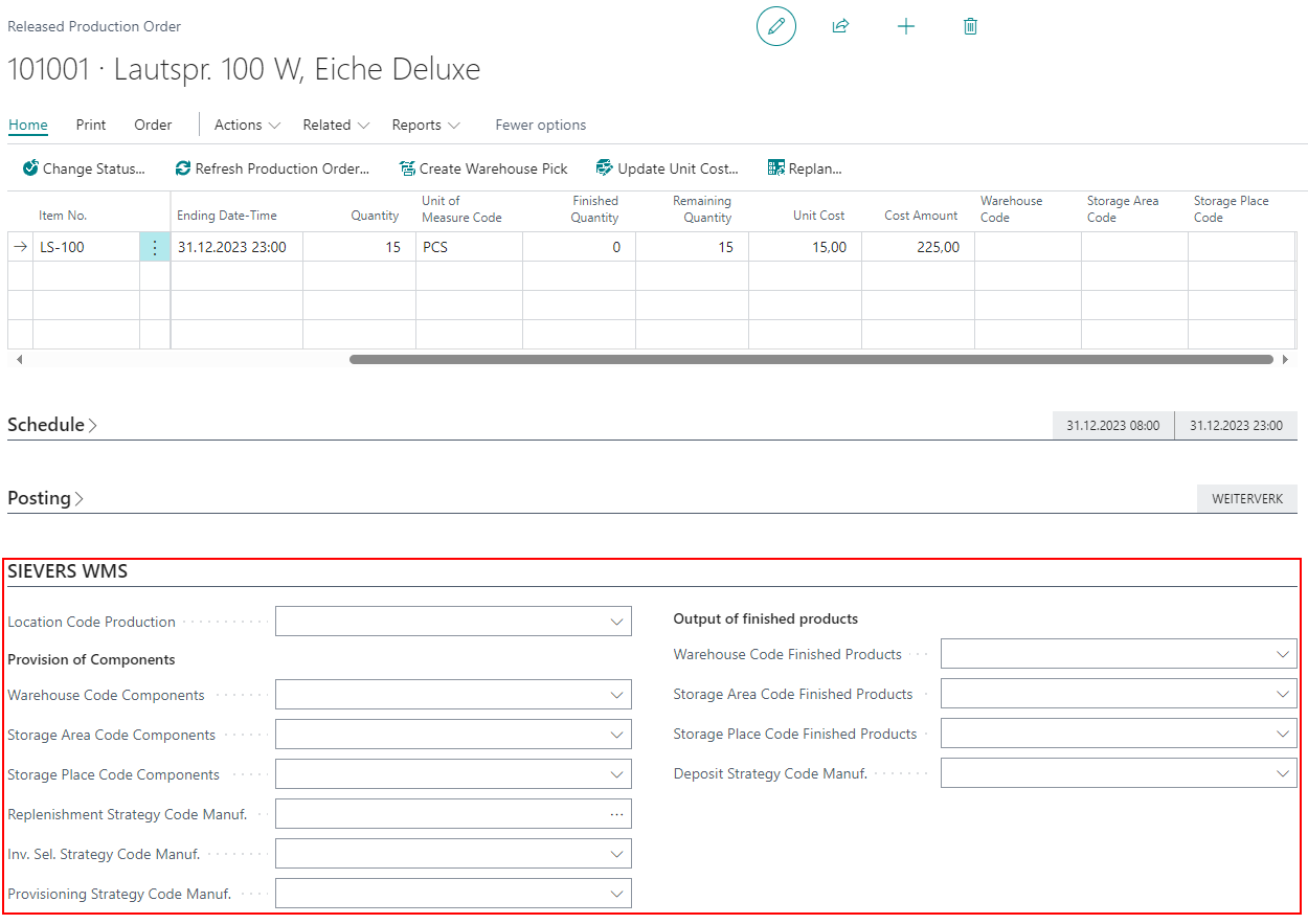 - Warehouse Code/Storage Area/Storage Place Finished Products: Defines the target location of the finished product