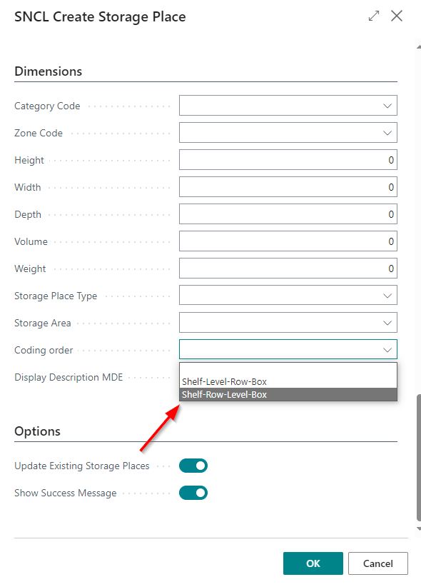 When creating new storage places in a warehouse, you can decide in which order the storage place code should be shown.