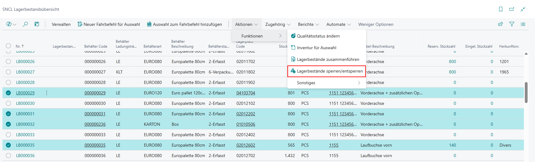 Es gibt nun eine Möglichkeit, beliebig viele Lagerbestände gleichzeitig zu sperren. Das ist insbesondere in Lagern mit Seriennummern oder >1 Lagerbestand pro Ladungsträger sehr hilfreich.