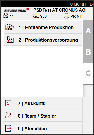 Diese Seite dient der Verarbeitung von Mengen aus dem Lager für die Produktion. Hier kann der Mitarbeiter sehen, welche Fahrbefehle zur Bearbeitung freigegeben sind, Fahrbefehle auswählen und bearbeiten.