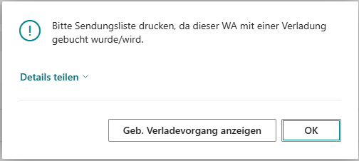 Wenn ein Warenausgang mit einem Verladevorgang ausgeliefert / gebucht wurde, muss eine Sendungsliste aus den gebuchten oder ungebuchten Verladevorgängen heraus gedruckt werden. Wurde das nicht gemacht, gibt es eine Fehlermeldung, die darauf hinweist. Wir haben diese Fehlermeldung nun durch einen Button erweitert, der direkt zum Verladevorgang führt. So spart sich der Nutzer einen zusätzlichen manuellen Seitenaufruf.