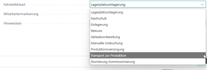 Wir haben die Fahrbefehlsart Versorgung Produktion umbenannt zu Transport zur Produktion. Hintergrund dieser Umbenennung ist, dass diese Fahrbefehlsart für die 2-stufige Produktionsversorgung genutzt werden soll und der neue Name diese Funktion deutlicher herausstellt.