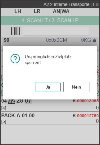 - Urspr. Zielplatz sperren A2: Bewirkt, dass beim Suchen eines neuen Zielplatzes in A2 der ursprüngliche Zielplatz gesperrt werden kann. Hierzu gibt es eine entsprechende Abfrage beim wechseln des Zielplatzes in A2. Das ist dann sinnvoll, wenn der Wechsel erfolgt, weil der eigentliche Zielplatz nicht nutzbar ist.