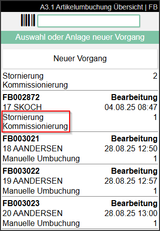 Mit Release 49 haben wir die neue Fahrbefehlsart Stornierung Kommissionierung eingeführt. Diese ist Teil des Kommissionier-Storno-Prozesses. Damit diese Fahrbefehle mobil abgearbeitet werden können, werden sie nun in A3 Artikelumbuchung angezeigt.