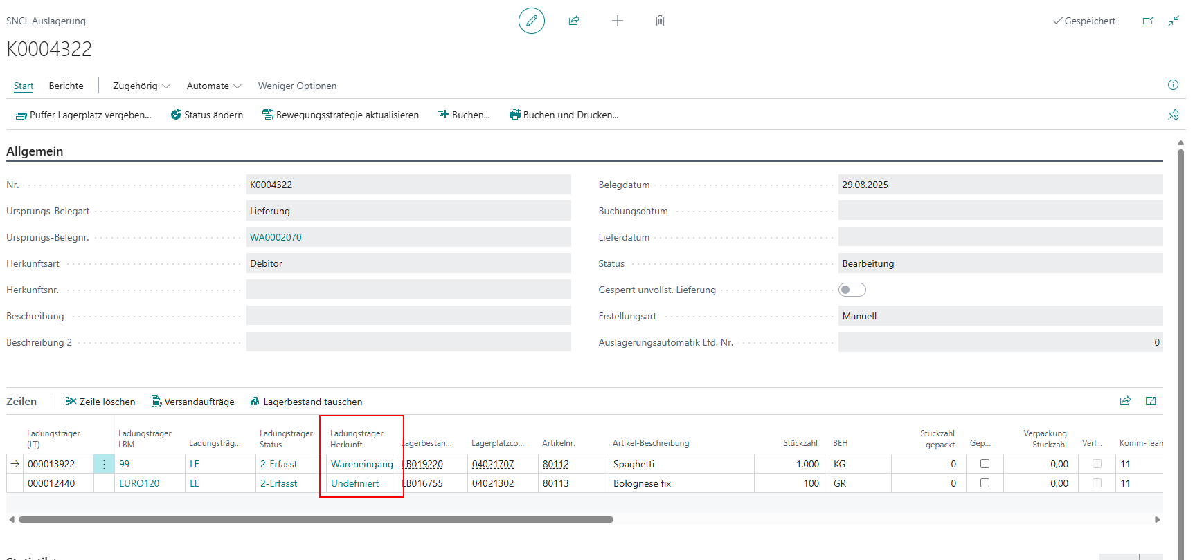In der SNCL Ausgehende Lagerbuchung und der gebuchten Ausgehende Lagerbuchung befindet sich in den Ausgehende Lagerbuchungszeilen nun dieses Feld: