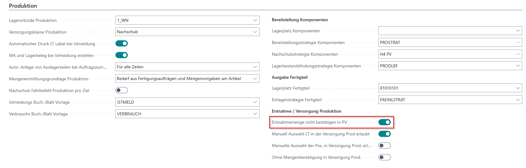 Entnahmemenge nicht bestätigen in PV nun im Abschnitt Produktionsversorgung - Item 115046