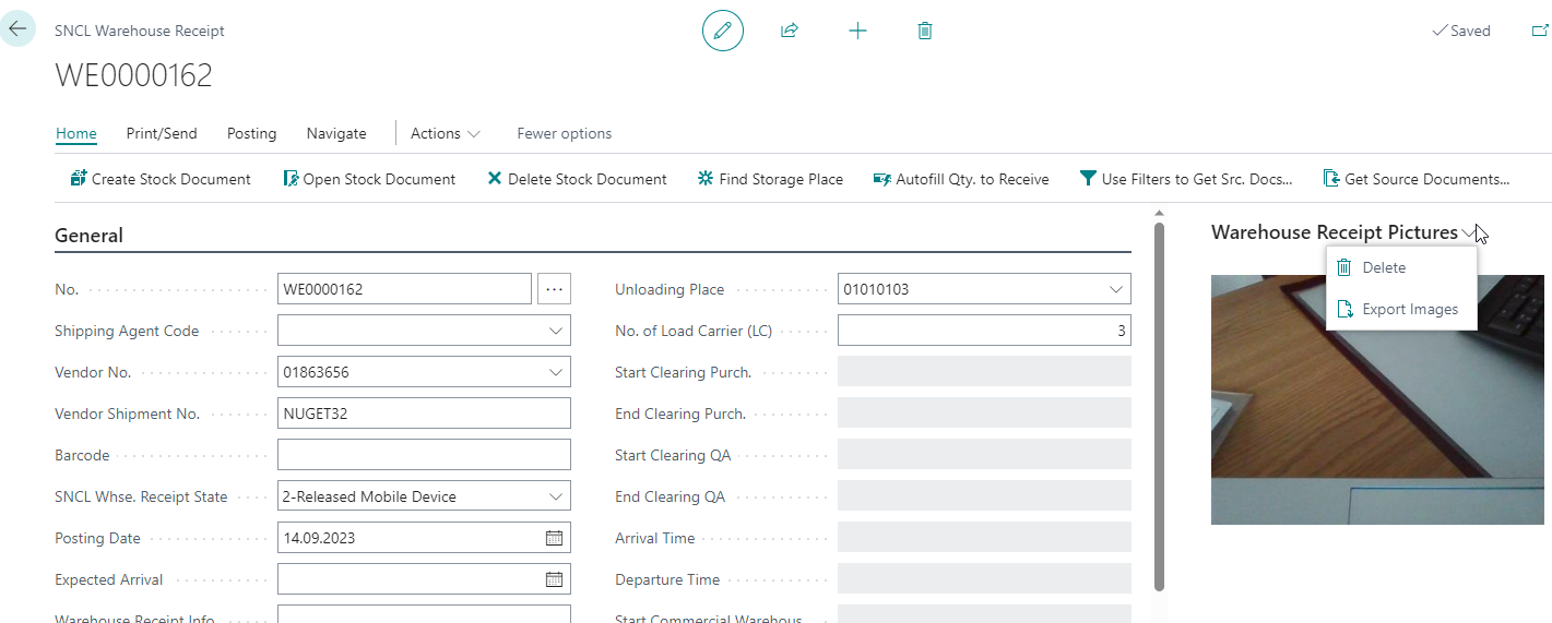 The first picture taken is displayed in the warehouse receipt factbox in Business Central. Here you are also able to delete and export all taken pictures. The photos taken are also stored in the posted warehouse receipt.