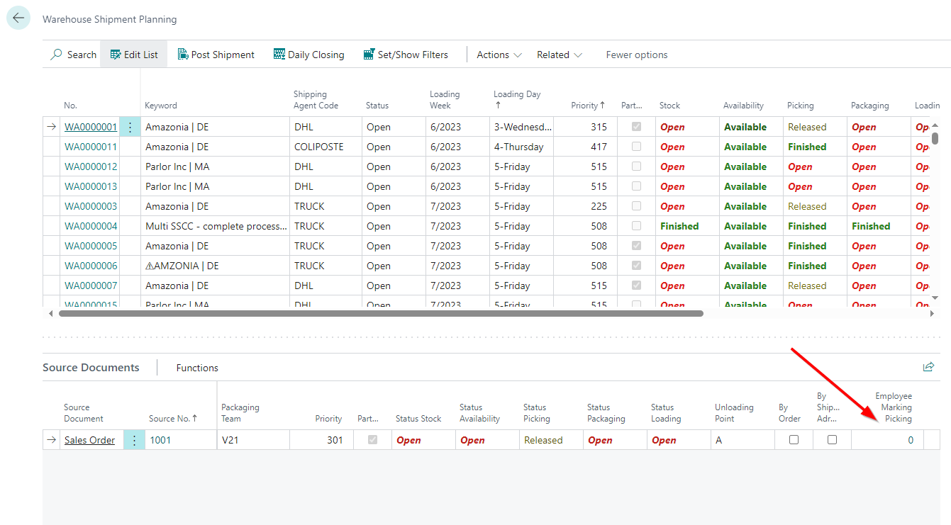 Employee markings are set in the picking document when an employee takes over a pick or a packing process via MDE. These employee markings can now also be viewed in Warehouse Shipment Planning at item level and in the source documents.