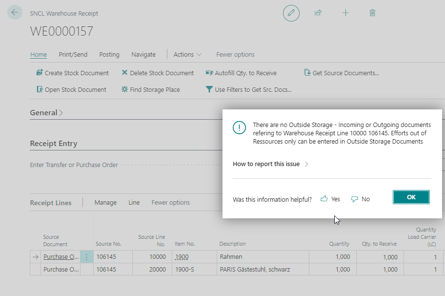 A new error message will be displayed when you try to open a outside storage ressources in the receipt lines of the warehouse receipt if no outside storage document exists.