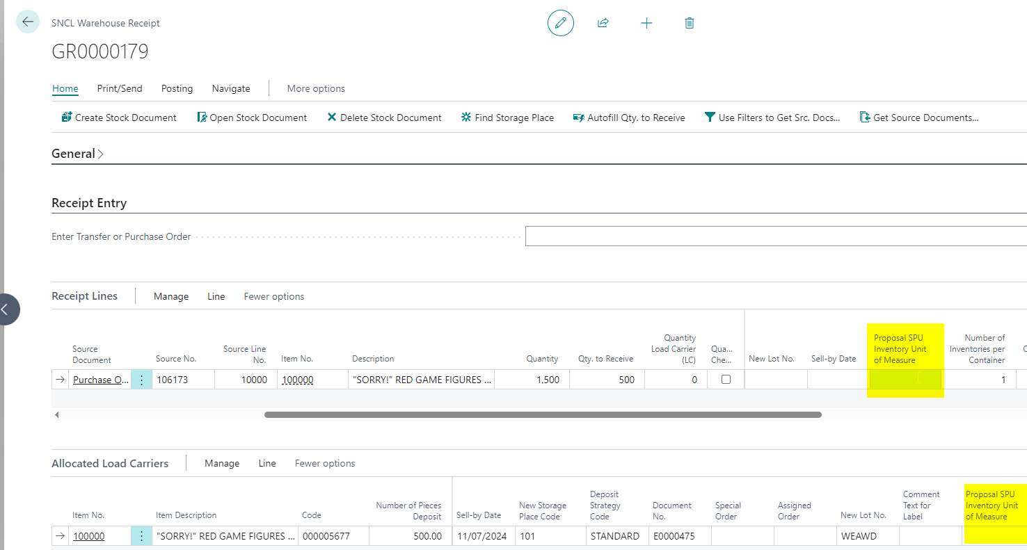 Page Warehouse Receipt at the sections Receipt Lines and Allocated Load Carriers -> Proposal SPU Inventory Unit of Measure