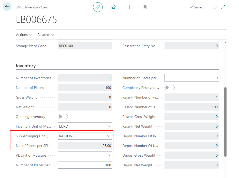 If you enter an SPU in the field on the Items page, this SPU will be proposed in the Warehouse Receipt in the field Proposal SPU Inventory Unit of Measure in the Receipt Lines. This is a proposal, so the user is able to change or even delete it. The SPU proposal from here will be transferred over to the Allocated Load Carrier lines after creating load carriers. If several Inbound Stock Posts have been created on a load carrier, you can use the SNCL Inbound Stock Post lines to enter different sub-packaging units per inventory.