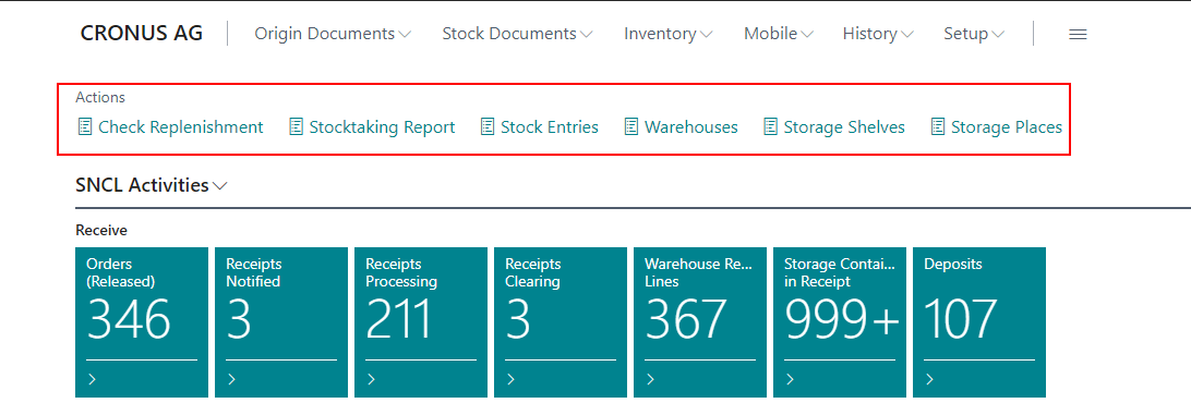 We have removed the old actions from the role center action menu of the SIEVERS WMS role and added some new, more useful actions in their place: